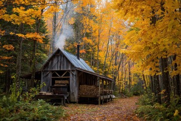 Rustic Sugar Shack in Autumn Forest: A Rural Canadian Maple Cabin Experience in Quebec
