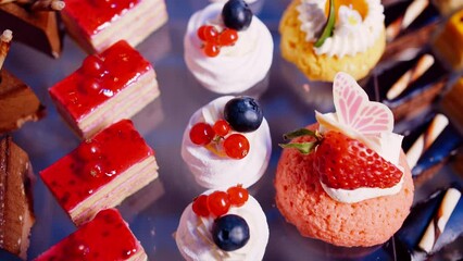 Small cakes and desserts on glass table, top down view