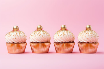 A vibrant and playful pattern of sweet, pastel cupcakes sprinkled with sugary icing adorns a tranquil pink surface. Retro food cake pattern.