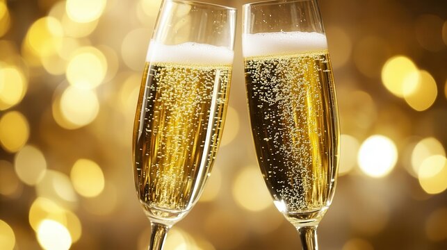 elegant champagne flutes filled with bubbling golden liquid clinking together in a celebratory toast soft bokeh background suggests a festive occasion