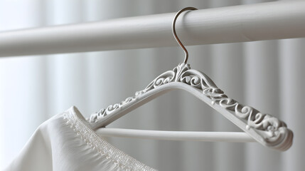 A close-up shot of a decorative clothes hanger, showcasing intricate design and elegance. The garment hanging on the hanger suggests a sense of style and sophistication