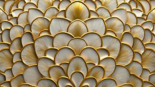 Gold and white flower pattern with many petals. The gold and white colors give the impression of luxury and elegance. The intricate design of the petals suggests a sense of sophistication