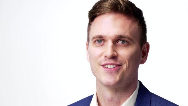 A faceless businessman in a blue suit and tie stands with outstretched arms, his head replaced by a street sign that says "HIRE ME."
