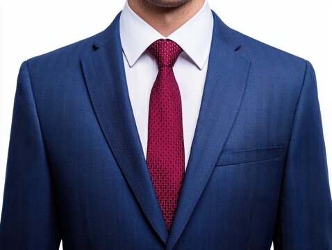 Close up of classic navy blue suit jacket with red tie, white shirt, and elegant style