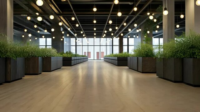 Modern indoor space with greenery and ambient lighting suitable for events or gatherings