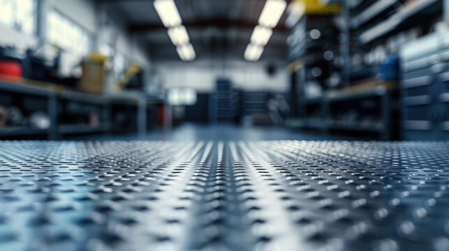 Empty metal surface with a backdrop of blurred automotive tools and parts, suitable for auto product advertisements.