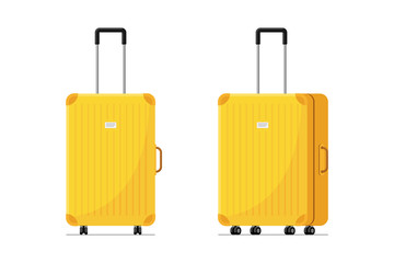 Yellow plastic suitcase for travel with wheels and retractable handle front and side view. Baggage bag for summer vacatoin jourmey flat vector illustration