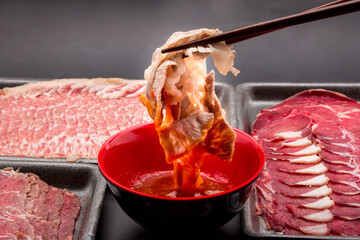 Chopsticks are picking up cooked meat and dipping in the dipping sauce. Sliced raw beef place in a row on a black plastic tray for cooking, fresh meat for grilling, yakiniku, sukiyaki or shabu.