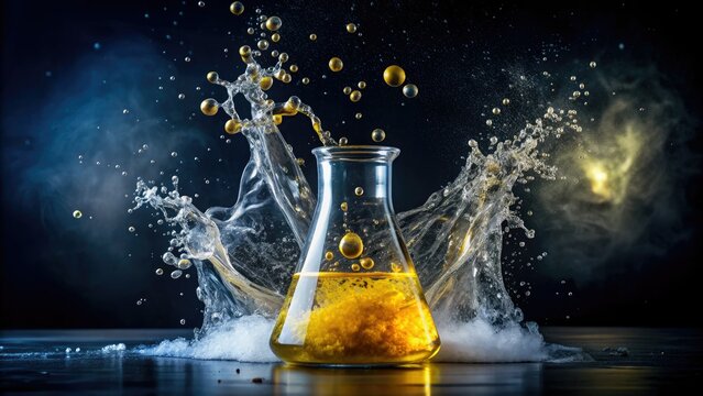 Yellow hazardous chemical substance splashing in a laboratory beaker, with bubbles and foam, against a dark background, symbolizing scientific experimentation and toxic material handling.
