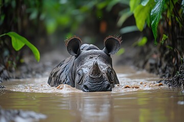 A Sumatran rhinoceros, a critically endangered species, walks through a muddy stream in the jungle.
