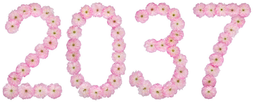 Inscription 2037, from natural pink flowers of almond tree, isolated on white background