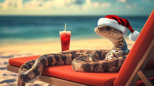 Festive snake on a lounge chair on a sunny tropical beach with a refreshing drink in a Santa hat. Year of the Snake, 2025. New Year in the tropics.