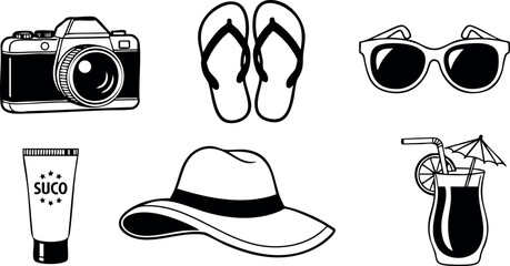 Summer vacation essentials vector set with camera, flip flops, sunglasses, sun hat, sunscreen, and cocktail illustration