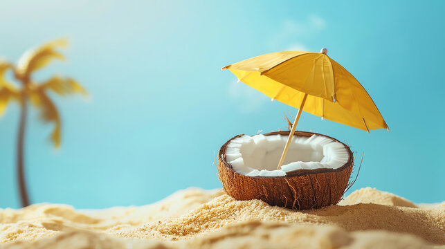 Coconut half on sandy beach with a yellow umbrella, symbolizing summer relaxation and tropical vibes under a sunny blue sky.