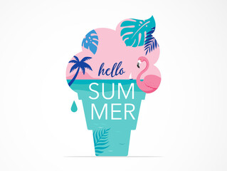 Summer time fun concept design. Creative background of landscape, panorama of sea and beach on ice cream cone. Summer sale, post template