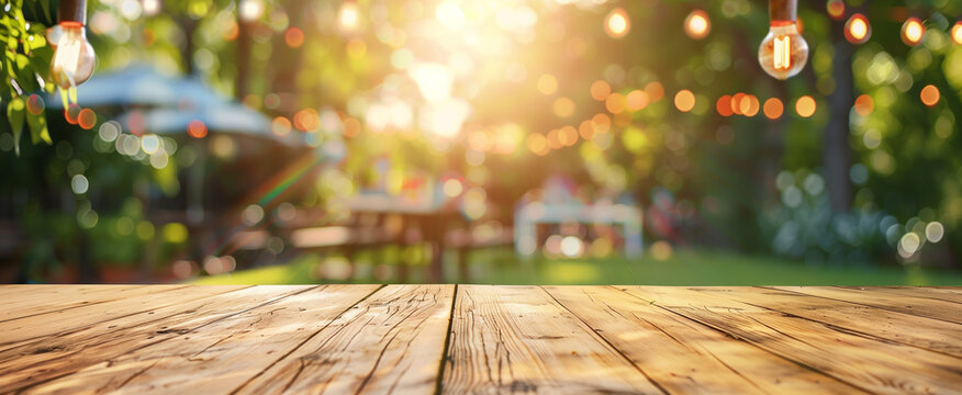 Wooden board table and blurred colorful summer garden party decoration setting in background.
