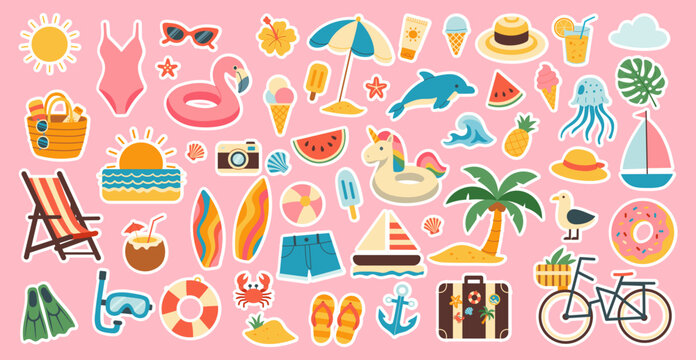 A collection of stickers featuring various beach and summer-related items such as umbrellas, boats, and sunglasses