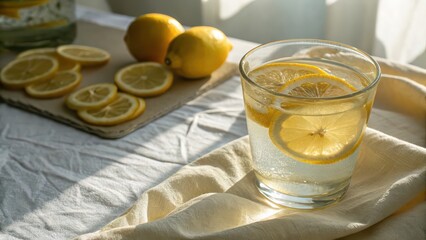 Glass of refreshing lemon water with lemon slices on fabric in natural sunlight, ideal for wellness product ads, hydration campaigns, detox lifestyle content, clean eating visuals, and health blogs