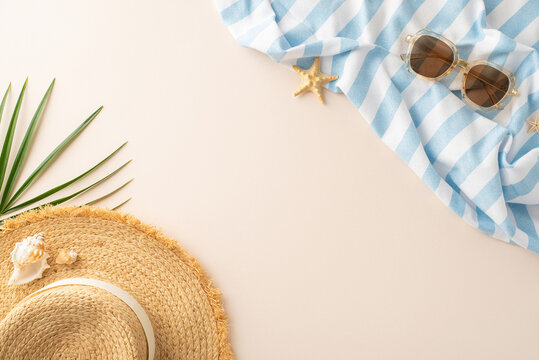 Sunny day essentials: top view of straw hat, shades, beach blanket, palm leaf, shells, and starfishes on a sandy backdrop, perfect for your summer message or promotion