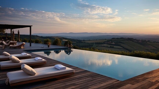 Infinity pool that appears to merge with the horizon, offering stunning views of the Italian countryside. Include a sun deck and a poolside bar for ultimate relaxation