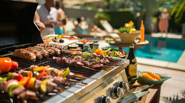 Sizzling Summer Barbecue Party by the Pool with Grilled Meats, Vegetables, and Lively Decorations