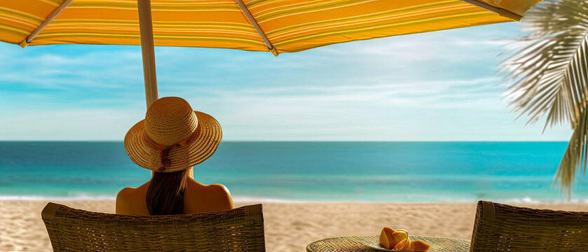 A women on her summer vacation on a tropical beach under an umbrella looking at the ocean.  A holiday in paradise (genertative AI)