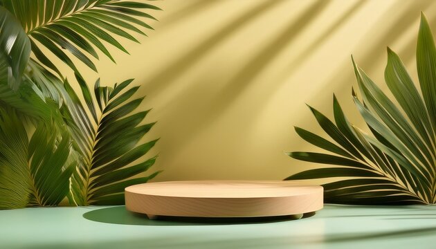 empty podium with leaves and shadow in tropical summer theme for product presentation copy space
