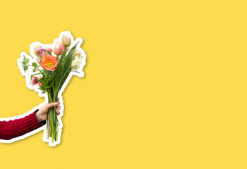 Hello Summer text and border from chamomile flowers on yellow background. Concept Welcome summer time. Banner