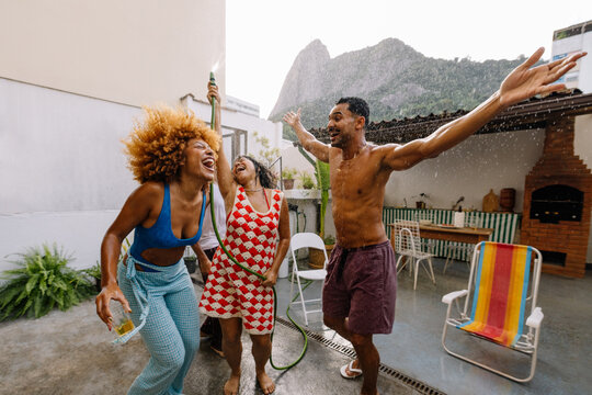 Friends cooling off with water on a hot summer rooftop in Rio