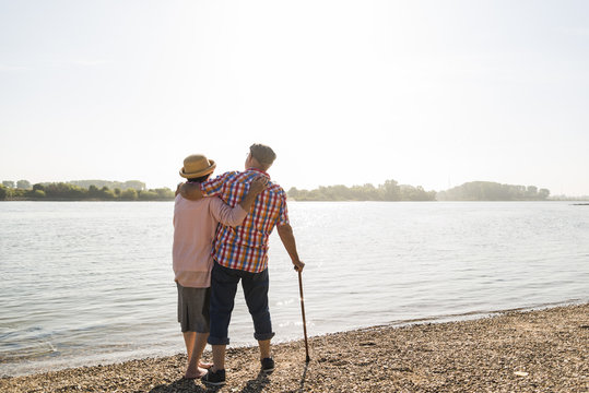 Germany, Ludwigshafen, back view of senior couple standing arm in arm at riverside