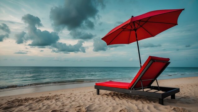 Beach chairs and umbrellas with beach ball, summer season, 3d rendering