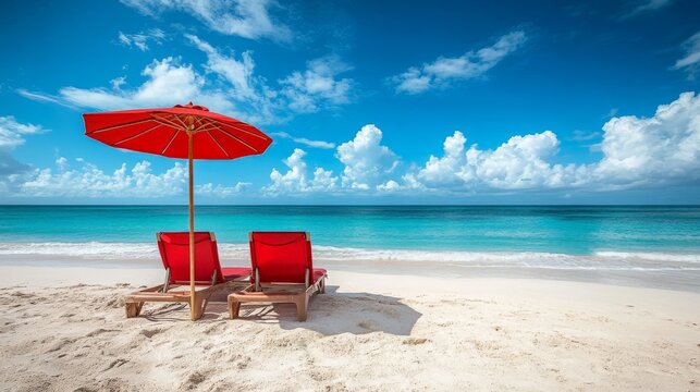 Family, relax and picnic in the sun on the beach for summer vacation, holiday or weekend getaway in the outdoors. People relaxing by the ocean coast with chairs and umbrella for free time in nature