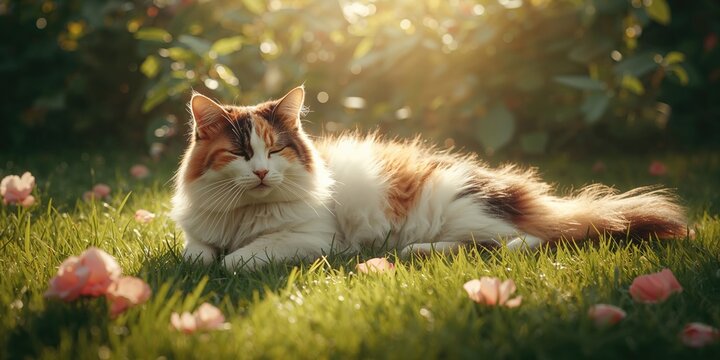 Sunbathing calico cat soaking up sunlight, illustrating feline relaxation