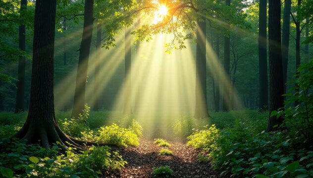 Radiant sunbeams dance across forest foliage , sunbeams, leafy branches