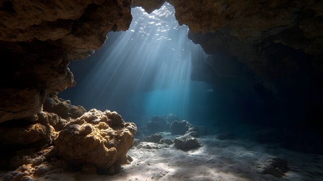 Underwater cave illuminated by sunbeams piercing the deep blue ocean water