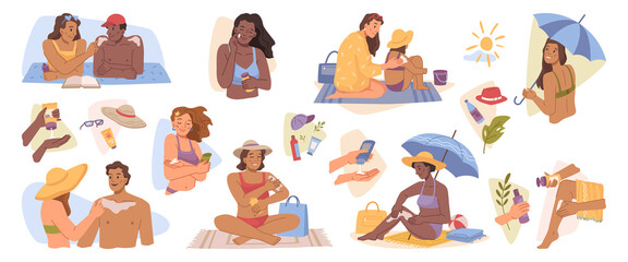 Men and women using sun lotion, applying sunblock and sunscreen with SPF. protection from rays and harmful impact of sunshine on beach. Flat cartoon character, vector illustration