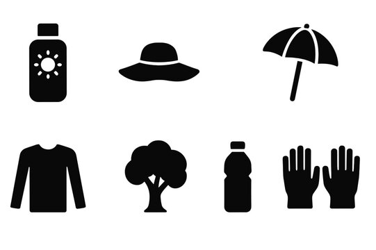 Sun Protection Icons. Solid, filled icon set of sunburn prevention: sunscreen bottle, sun hat, sunglasses, umbrella, long sleeve shirt, shade tree, water