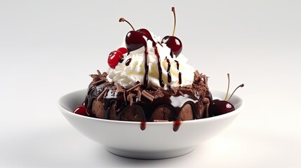 Brownie sundae ice cream in a bowl with brownie pieces, hot fudge sauce, whipped cream, and a cherry on top on White Background with copy space for your text created with generative AI technology