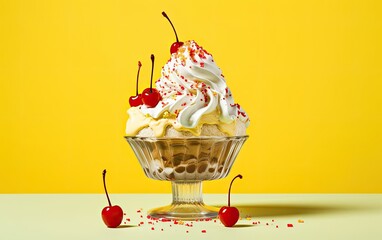 Ice cream sundae with multiple colorful scoops, topped with whipped cream, sprinkles, and a cherry, set against a vibrant yellow background