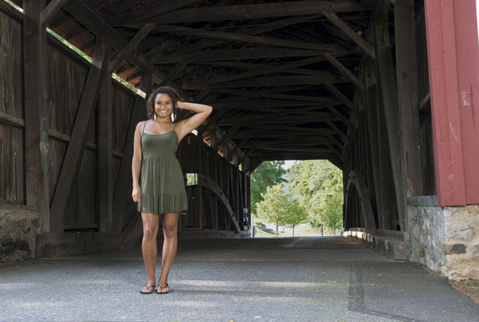 Stunning young biracial woman in green sundress standing in front of covered bridge