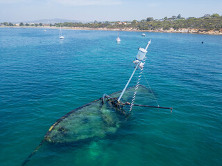 Aerial top view a wreck of a ship sunk in the shallow waters of and now abandoned to bad weather in Keyodhoo, Maldives