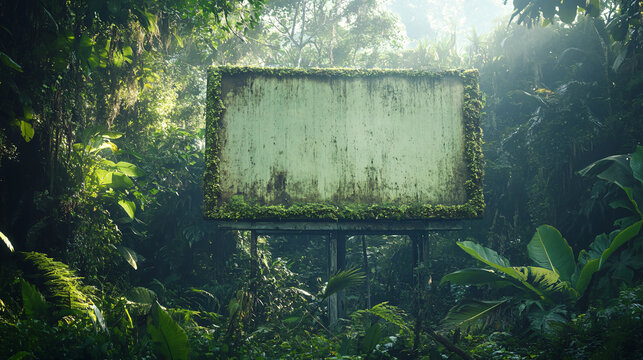 Nature's Canvas: Moss-Covered Billboard in Lush Rainforest Setting for Environmental Awareness Campaign