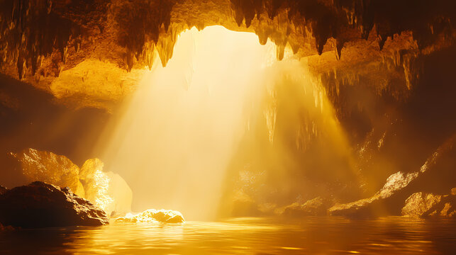 A serene golden cave with sunlight streaming through, creating a peaceful and luminous atmosphere. Luminous Whispers. Illustration