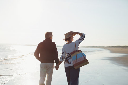 Elderly couple enjoying beach sunset highlighting retirement bliss