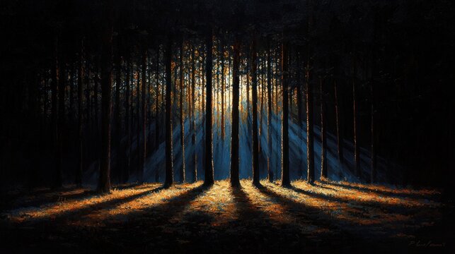 Painting depicts a sunlit forest scene; vertical trees with light rays illuminating the ground, creating long shadows