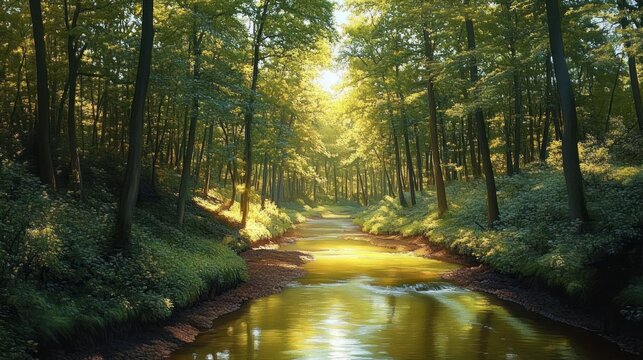 sunlit forest with narrow golden river, tall slender trees and lush mossy banks, dappled sunlight through the canopy creating a serene peaceful atmosphere