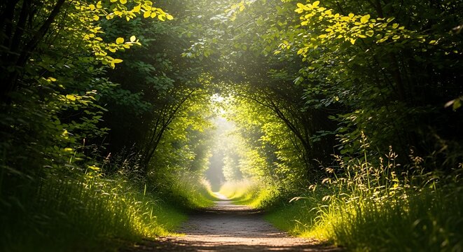A sunlit path winds through a lush green tunnel of trees, creating a serene and inviting scene.