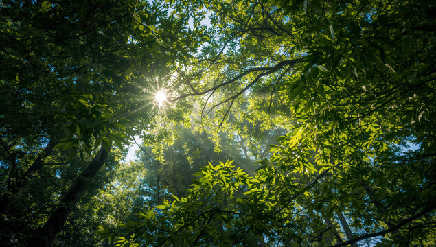 Sunlit forest canopy with green leaves and sunbeams creating serene atmosphere
