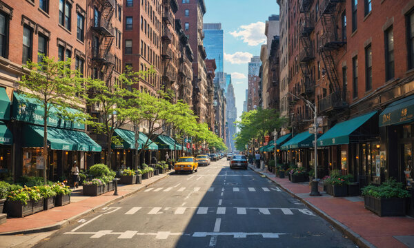 Sunset on the corner of 23rd Street and 5th Avenue with people and cars in Manhattan, New York City