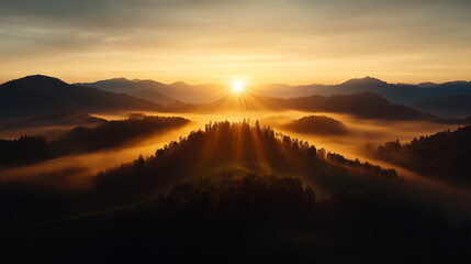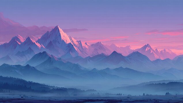 Serene sunset over a vast, layered mountain range, rendered in soft, pastel purples and blues, with a hazy valley below